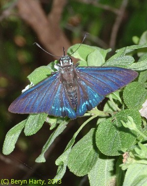 Medium-sized butterfly with a wingspan up to 2-3/4 inches. The wings are brownish-black, with an overall cobalt blue iridescence. The hindwing has iridescent turquoise blue streaks on both the upperside and underside. The caterpillar has a reddish-brown head with large yellow eye patches. Young caterpillars are red with transverse yellow stripes; adults are waxy white.