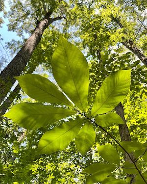 Description: Deciduous large shrub or small tree up to 25 feet. Forms extensive colonies. Leaves 6-12 inches long, ovate and widest near the tip. Maroon flowers 1-2 inches wide emerging before the leaves. Large, greenish, fleshy fruit 3-5 inches long.