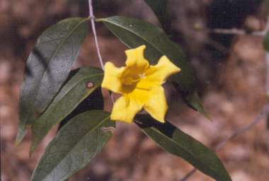 Description: Twining evergreen vine to 20 feet with dark green leaves 1 inch long. Bright yellow trumpet shaped flowers. Plant can be aggressive.