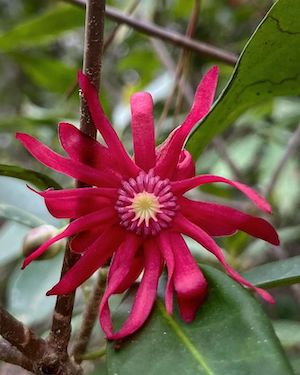 Description: Dense evergreen shrub 6-20 feet tall with leathery leaves and a rounded shape. Leaves are aromatic and smell of licorice when crushed or bruised. Deep red flowers with ribbon-like petals in the spring followed by brown star-shaped capsules in the late summer and fall.