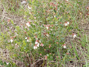 Description: Small compact densely-branched shrub with numerous underground branches. Leaves small, thick and shiny green, about 1/4 to 3/4 inches long.