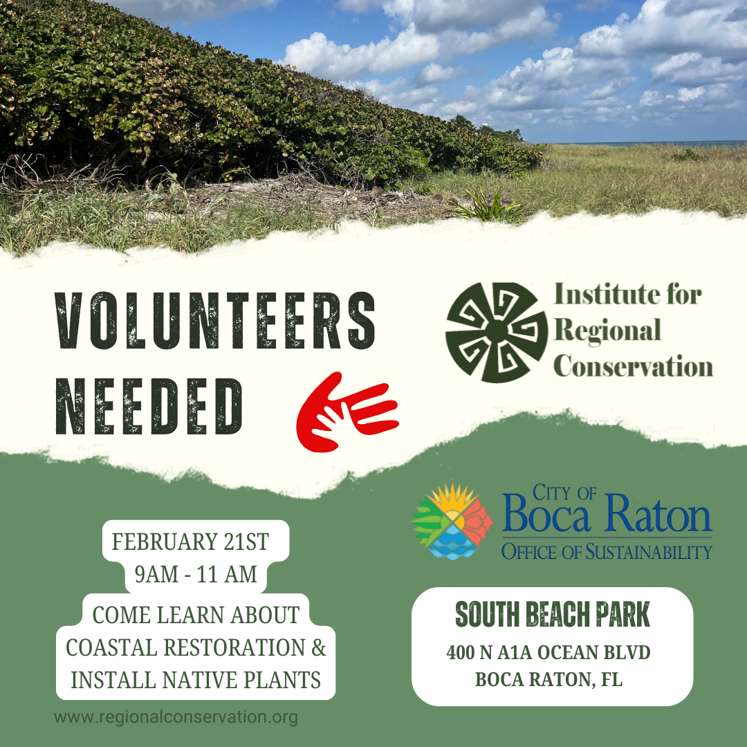 Join the Institute for Regional Conservation and the City of Boca Raton to restore the beach dunes at South Beach Park! On Saturday, February 21st come volunteer with us for a fun event where participants will install native plants and removed invasive species that are causing harm to the dunes. This allows us to enhance and restore the native biodiversity of the important beach dune ecosystem.